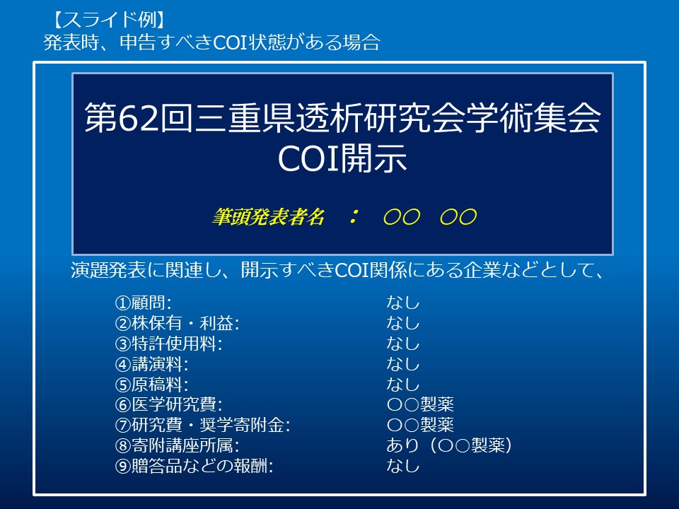 - 臨床研究に関するすべての発表において利益相反状態の有無にかかわらず、開示する必要があります。