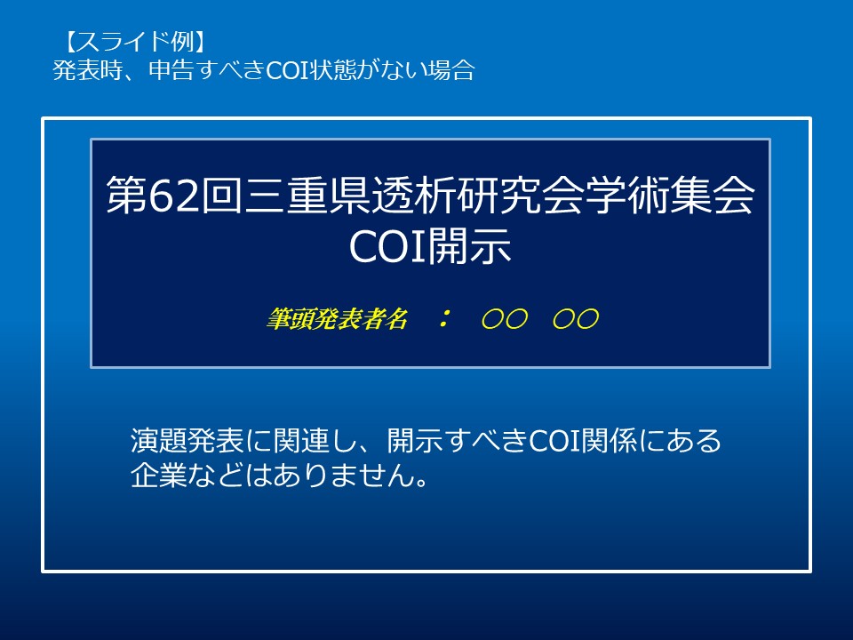 - ご発表スライドにタイトルスライドを設け、2枚目(タイトルスライドの後)にCOI開示スライドを入れて、開示してください。
